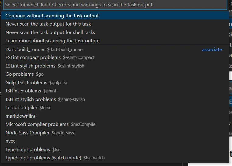実行したときの出力どうするかと聞かれるので、Continue without scanning the task outputを選択する。